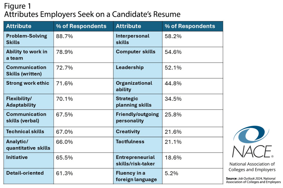 According to NACE’s (National Association of Colleges and Employers) Job Outlook 2024 report, these are the top attributes employers seek on a candidate’s resume: