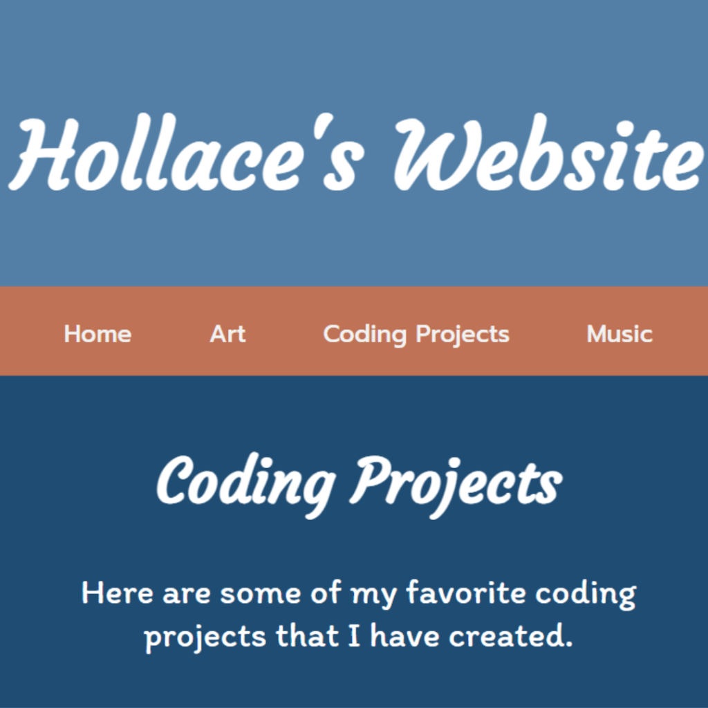 Hollace is both an accomplished coder and an artist. She supplements her online education with art classes and pairs her art and coding skills in website projects and other creations. She is interested in pursuing a career in web development or graphic design.