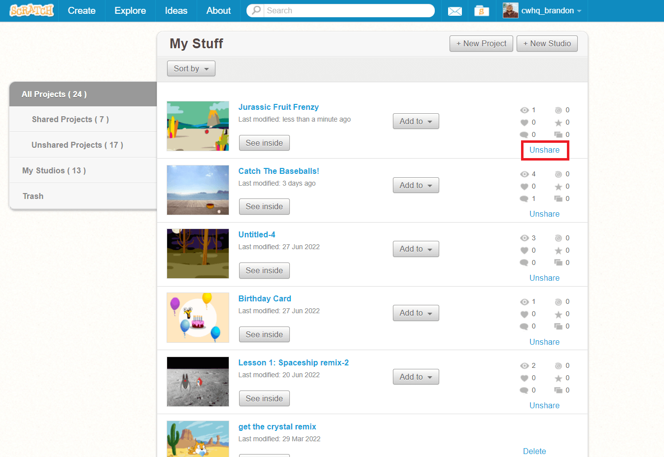 - Navigate to your “My Stuff” page and locate the project you would like to un-share.