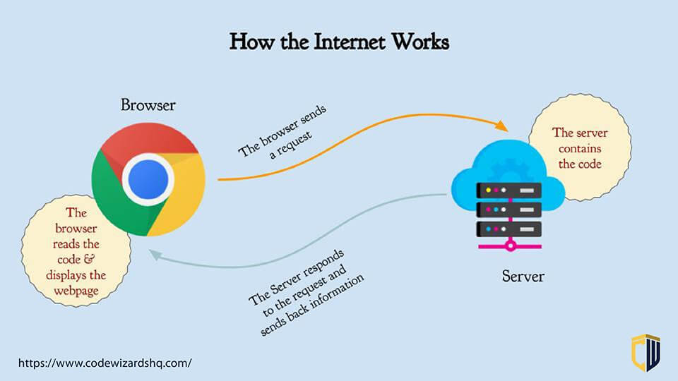 We’re interacting with computers and the internet every day, but how do they actually function? That’s what kids will learn about in computer science. For kids in our coding classes, we break down concepts around computer science with examples in the real world. This is a simple illustration of how the internet works that children easily understand: