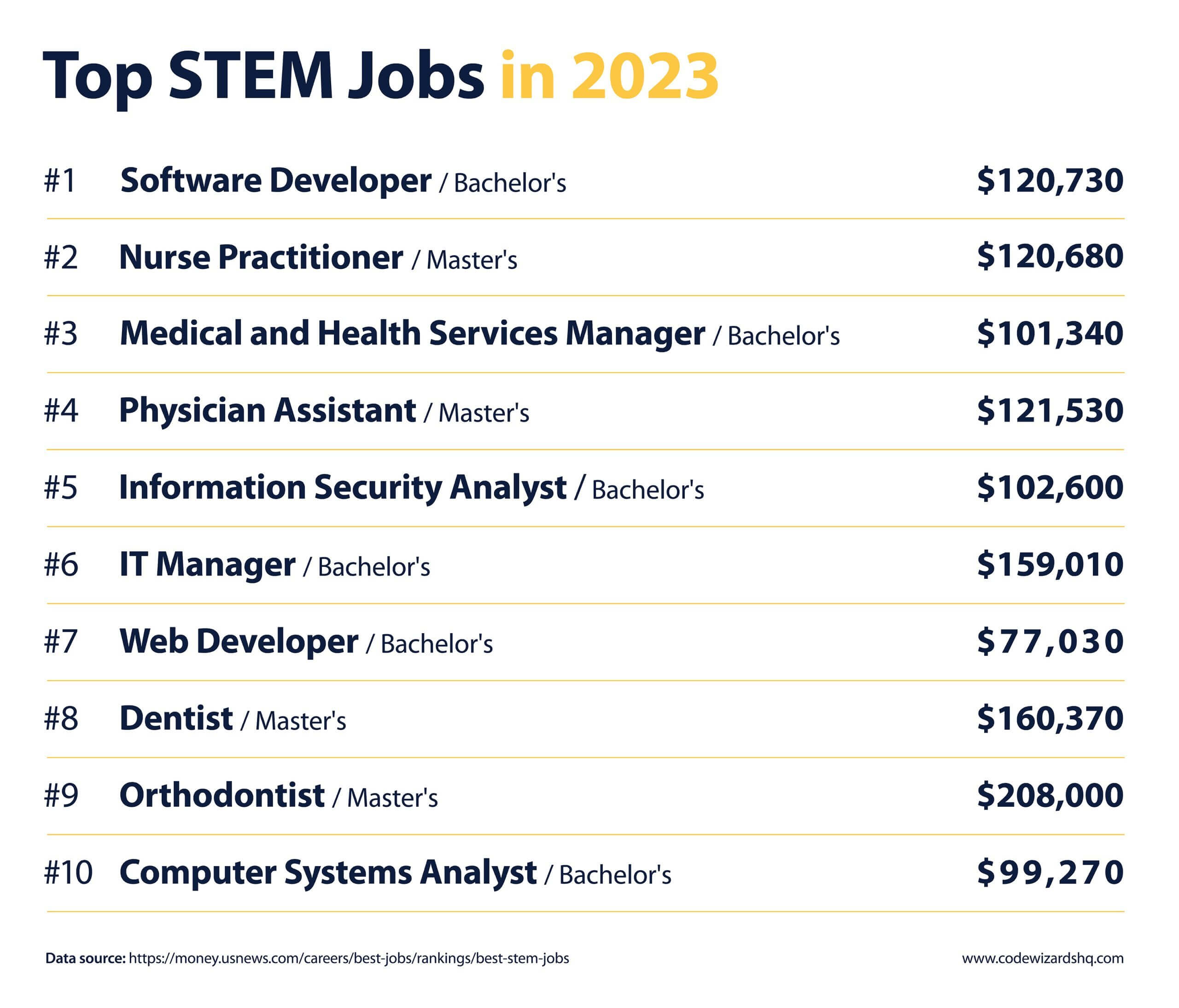 Studying computer science means your child has the skills to pursue some of the highest-paying jobs. In 2023, the top STEM job is Software Developer, with an average salary of $120,730.